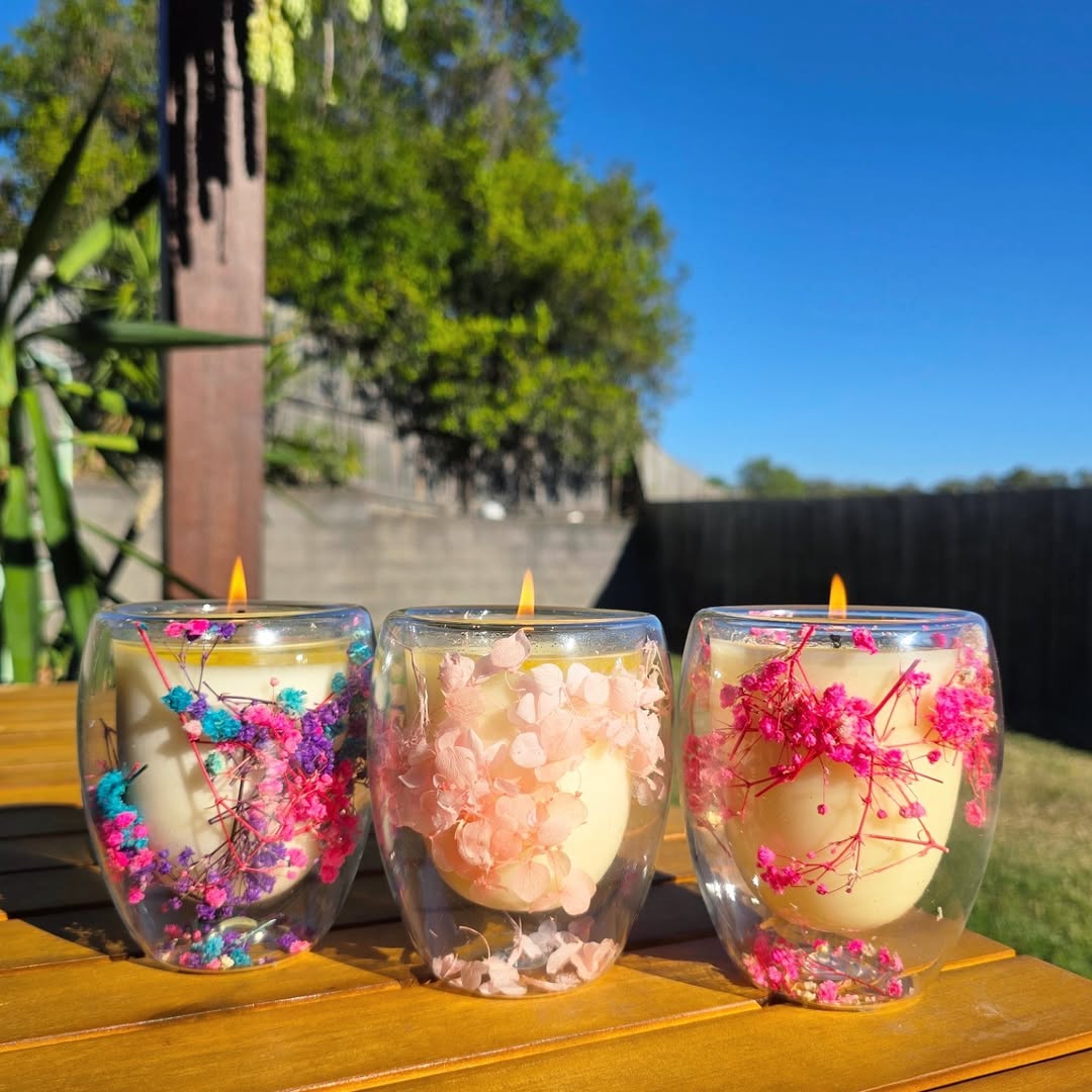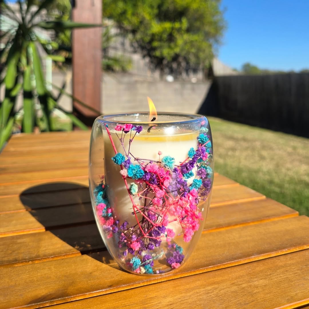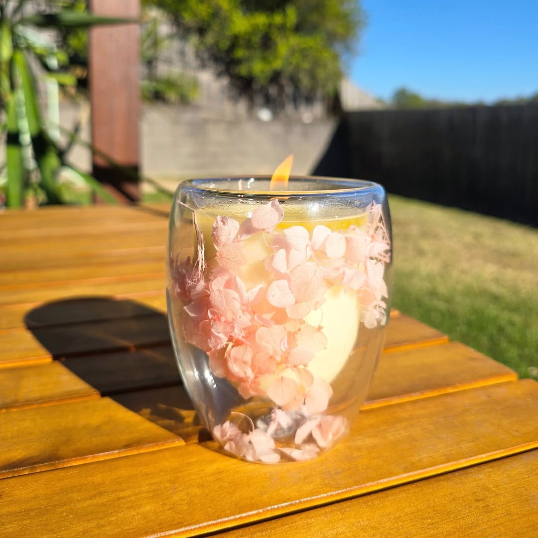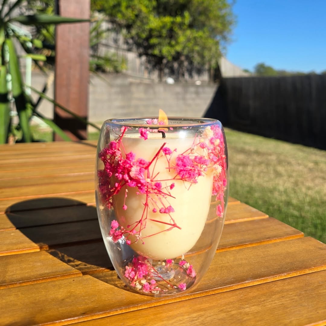 The prettiest candles we did ever create! Gorgeous double walled glassware filled with beautiful dried flowers. These candles are unique, with each vessel having the botanicals placed individually inside, no two are the same. These can also be refilled by us or can be washed clean and use as a fancy coffee/wine glass!